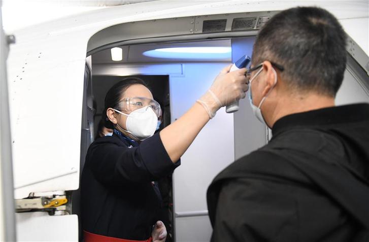 4月8日,在武漢天河國際機(jī)場(chǎng),乘坐東方航空MU2527航班的旅客登機(jī)前接受體溫檢測(cè)。 4月8日零時(shí)起,武漢市正式解除離漢離鄂通道管控措施,有序恢復(fù)對(duì)外交通。 新華社記者 程敏 攝