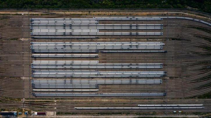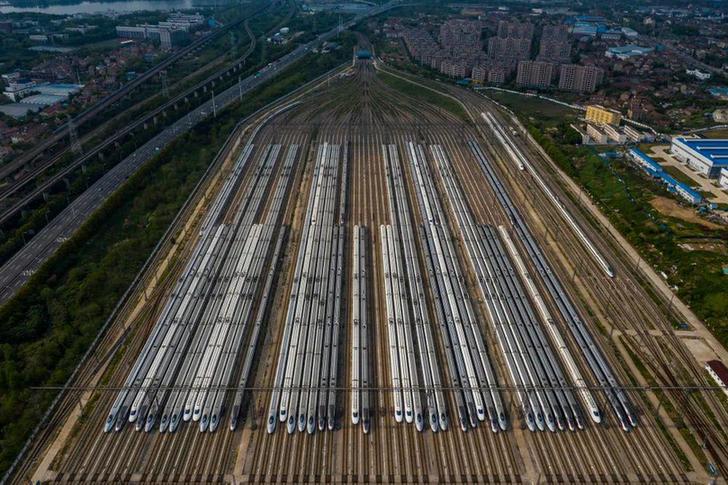 ▲ 4 月 7 日,在武漢動(dòng)車段,列車??吭诖孳嚲€上(無(wú)人機(jī)照片)。