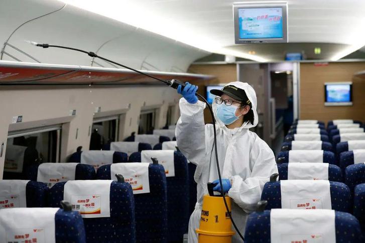 ▲ 4 月 7 日,武漢動(dòng)車段運(yùn)用車間工作人員周明輝在給列車消毒。