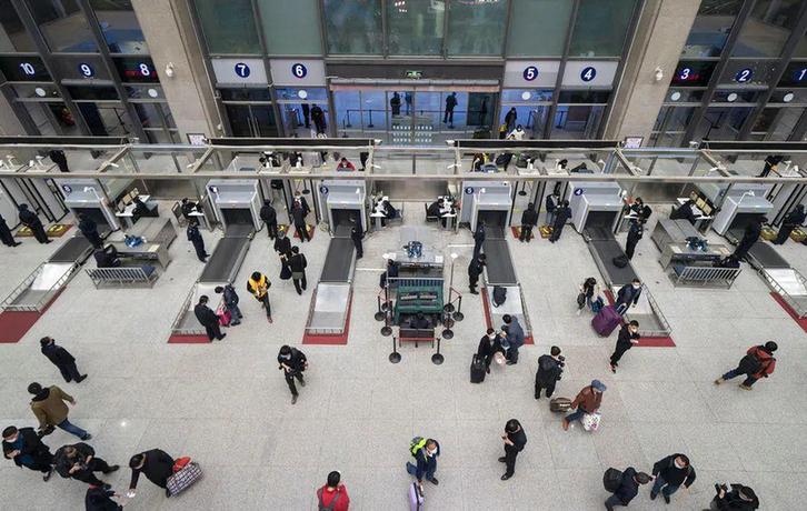 ▲ 4 月 7 日晚,旅客接受安檢后進(jìn)入武昌火車站。
