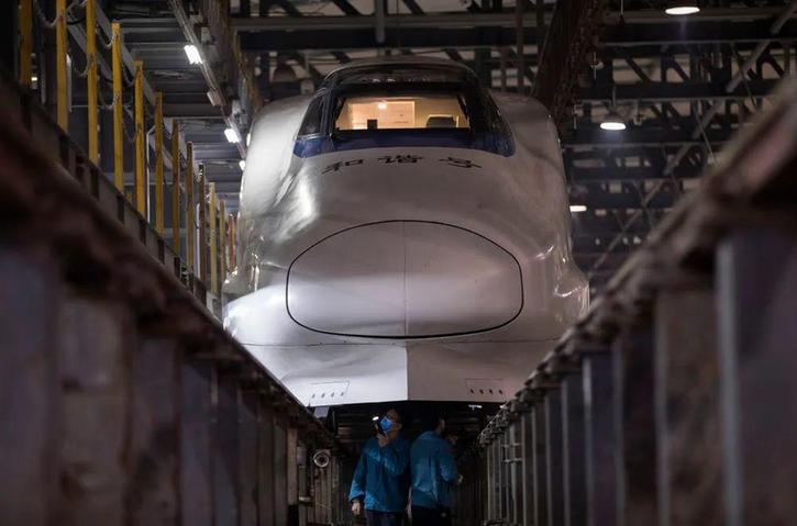 ▲ 4 月 8 日,武漢動(dòng)車段漢口動(dòng)車運(yùn)用車間地勤機(jī)械師涂夢(mèng)圓(左)和同事對(duì) D9301 次列車進(jìn)行檢查。