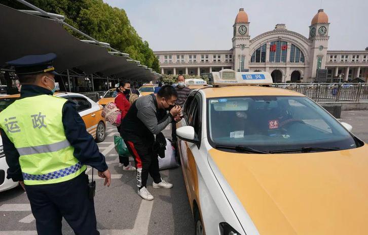 ▲ 4 月 8 日,在武漢漢口火車站前,乘客與出租汽車司機(jī)溝通。當(dāng)日,武漢巡游出租汽車恢復(fù)運(yùn)營(yíng),乘客憑健康碼 " 綠碼 " 實(shí)名乘車。