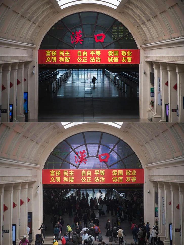 下圖:4 月 8 日拍攝的漢口火車站進(jìn)站大廳。(拼版照片)