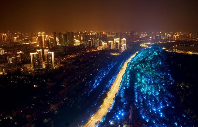 ↑武漢夜晚的“燈光秀”(4月13日攝)。