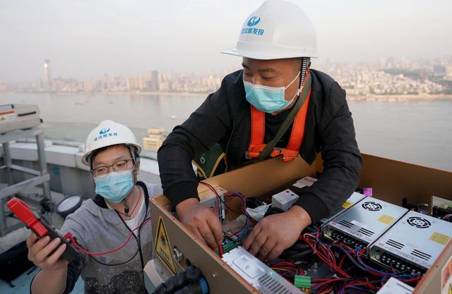 ↑武漢旅發(fā)投集團(tuán)江漢朝宗公司的工作人員在檢修激光燈(4月13日攝)。
