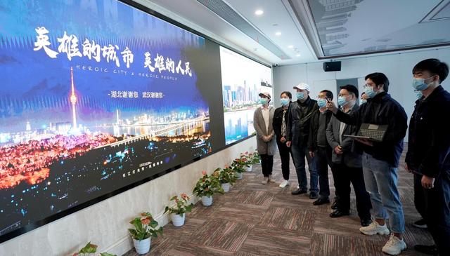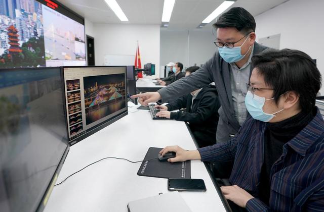 ↑武漢旅發(fā)投集團(tuán)江漢朝宗公司亮化控制中心的工作人員在商量“燈光秀”播放細(xì)節(jié)(4月13日攝)。