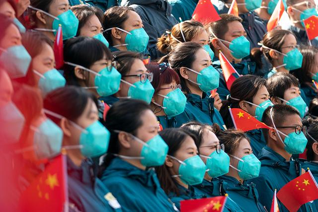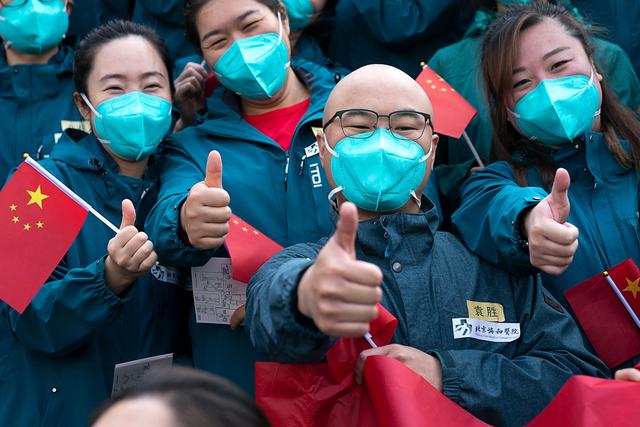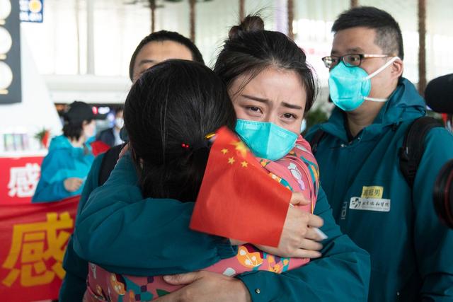 ↑4月15日,北京協(xié)和醫(yī)院國家援鄂抗疫醫(yī)療隊(duì)隊(duì)員揮舞國旗。