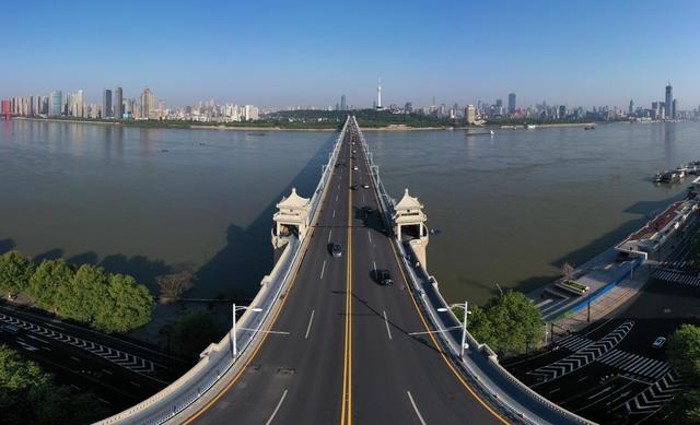 ↑4月15日在早高峰時(shí)段拍攝的武漢長江大橋。