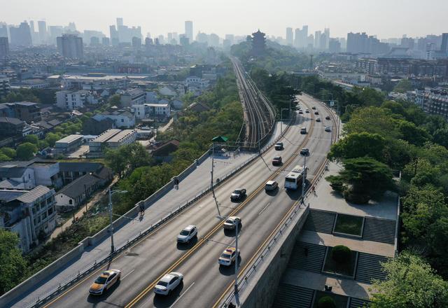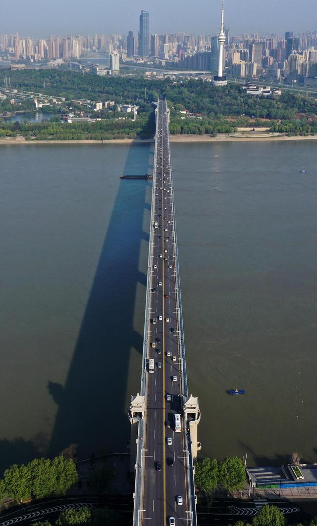 ↑4月15日在早高峰時(shí)段拍攝的武漢長江大橋(無人機(jī)照片)。