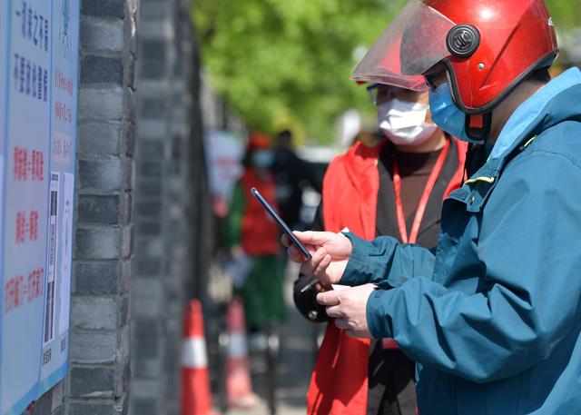 ↑4月15日,進入武昌戶部巷社區(qū)的人員在出入卡口掃健康碼。