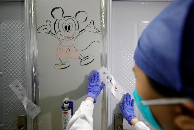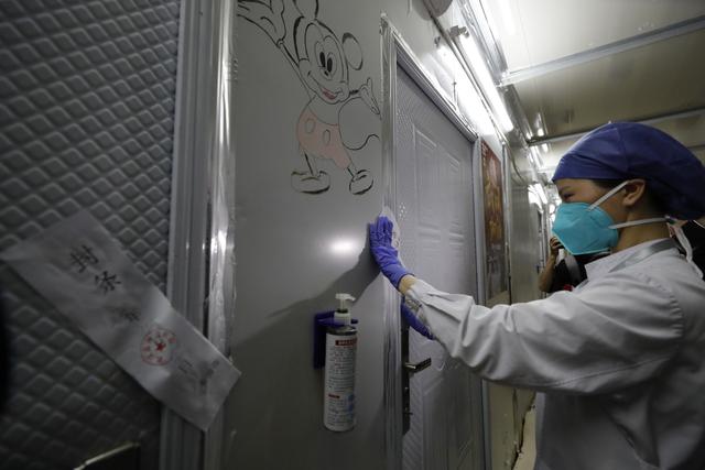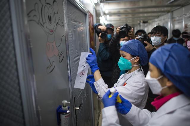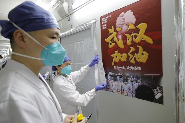 ↑4月15日,武漢大學(xué)中南醫(yī)院的護士在雷神山醫(yī)院病區(qū)貼封條。