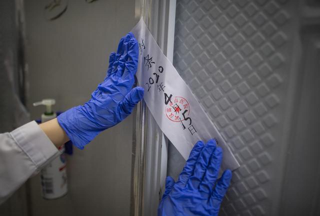 ↑4月15日,武漢大學(xué)中南醫(yī)院的護士在病區(qū)貼封條。