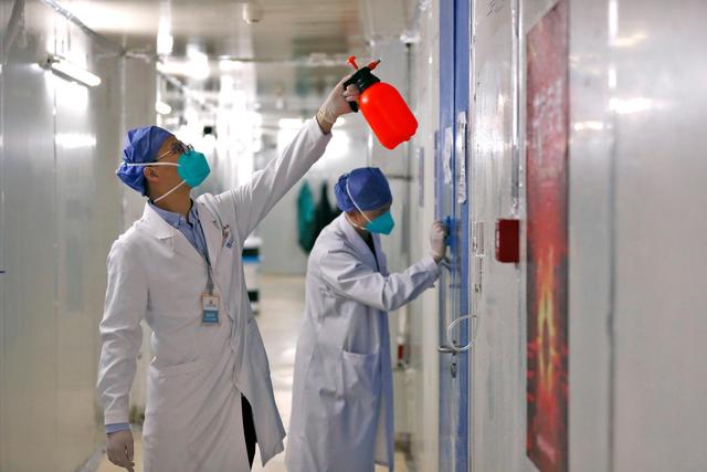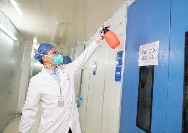↑4月15日,武漢大學(xué)中南醫(yī)院醫(yī)護人員對病區(qū)進行消殺。