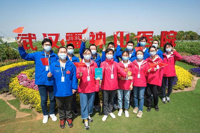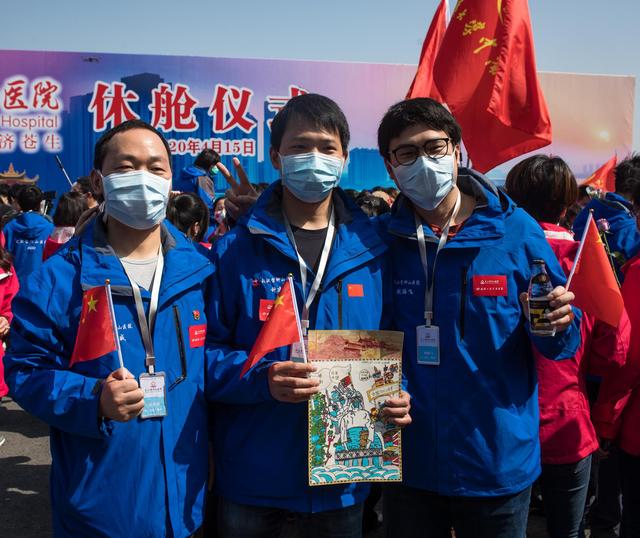 ↑4月15日,武漢雷神山醫(yī)院醫(yī)護人員在休艙儀式上。