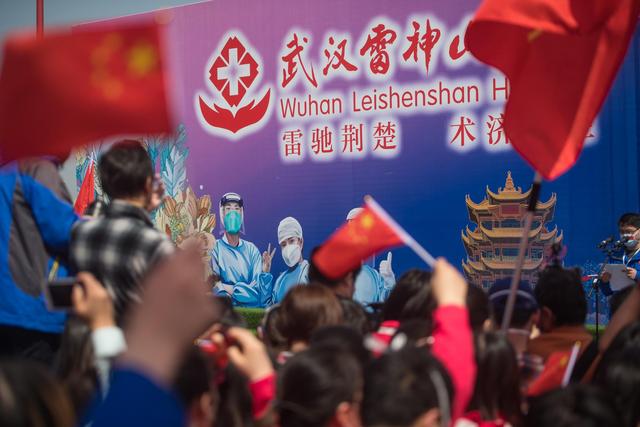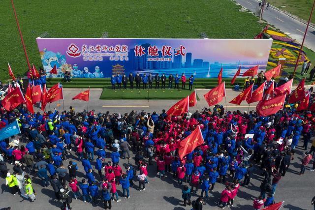 ↑4月15日拍攝的武漢雷神山醫(yī)院休艙儀式。