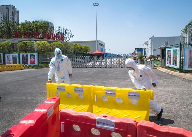 ↑4月15日,醫(yī)務(wù)人員在雷神山醫(yī)院病區(qū)貼封條。