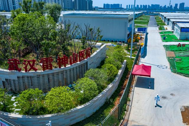 ↑4月15日,一名安保人員走出武漢雷神山醫(yī)院院區(qū)(無人機照片)。