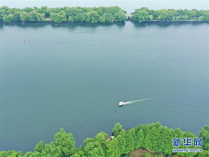 5月27日,船只在西湖上行駛(無人機照片)。 隨著氣溫升高,杭州西湖綠意蔥蘢,展現(xiàn)出柔美的湖光山色。新華社記者翁忻旸攝