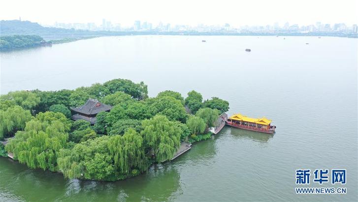5月27日,船只在西湖湖心亭靠岸(無人機照片)。 隨著氣溫升高,杭州西湖綠意蔥蘢,展現(xiàn)出柔美的湖光山色。新華社記者翁忻旸攝