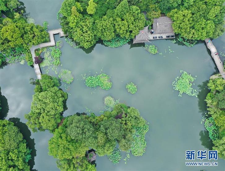 5月27日,游人在西湖曲院風荷景區(qū)游覽(無人機照片)。 隨著氣溫升高,杭州西湖綠意蔥蘢,展現(xiàn)出柔美的湖光山色。新華社記者翁忻旸攝
