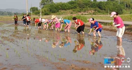 圖為農(nóng)戶們正在水稻田里插秧。新華網(wǎng)發(fā) 王華斌攝