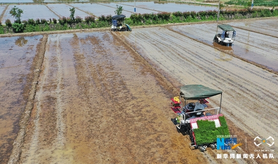 圖為臺州仙居農(nóng)戶們正操作插秧機(jī)插秧。新華網(wǎng)發(fā) 王華斌攝