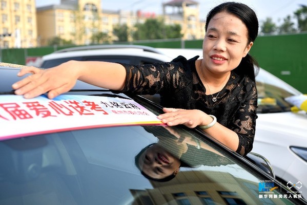 7月3日,在安徽省亳州市光明東路舉行的愛(ài)心送考啟動(dòng)儀式上,愛(ài)心司機(jī)為汽車貼上“愛(ài)心送考”標(biāo)識(shí)。新華網(wǎng)發(fā)(劉勤利攝)