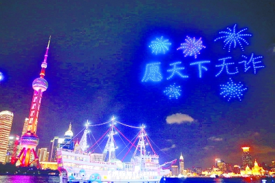 晨報訊昨晚,500架無人機在空中構(gòu)筑“上海反詐進行時”公益宣傳矩陣,“謹防網(wǎng)戀陷阱”“愿天下無詐”等字樣、圖案在北外灘夜空中璀璨呈現(xiàn),吸引市民群眾駐足觀看。