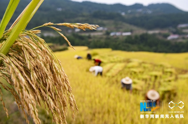 圖為高山冷水稻進(jìn)入收割期,田間地頭一派繁忙。新華網(wǎng)發(fā)(鄭家裕攝)