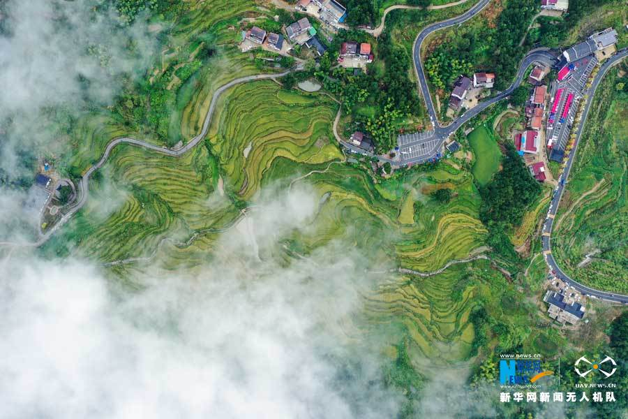 圖為航拍秋雨綿綿的霧云山梯田宛若仙境。新華網(wǎng)發(fā) 陳頂云 攝