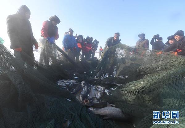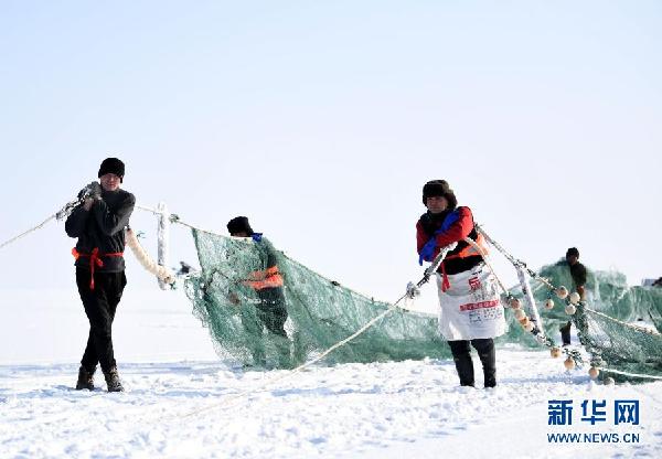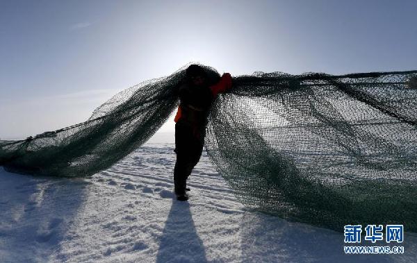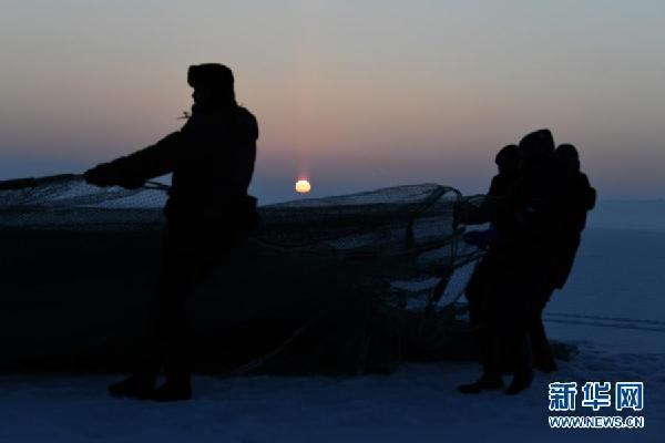 12月27日,漁工們在烏倫古湖捕魚。