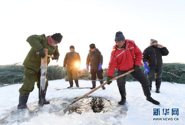 12月27日,漁工們在烏倫古湖鑿開一個(gè)下網(wǎng)眼。