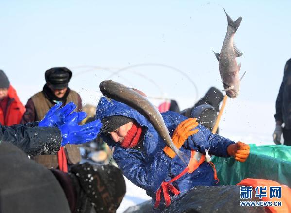12月27日,漁工們在烏倫古湖將捕到的魚拋至冰面,出水的魚很快被冷凍。
