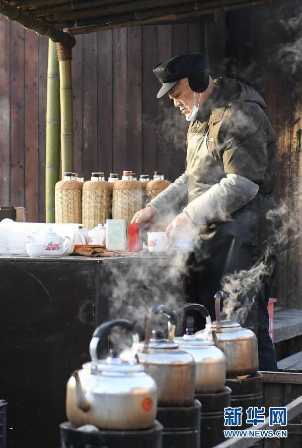 1月12日,一名攤主在烏鎮(zhèn)一邊煮茶一邊給客人制作早餐。新華社記者 翁忻旸 攝