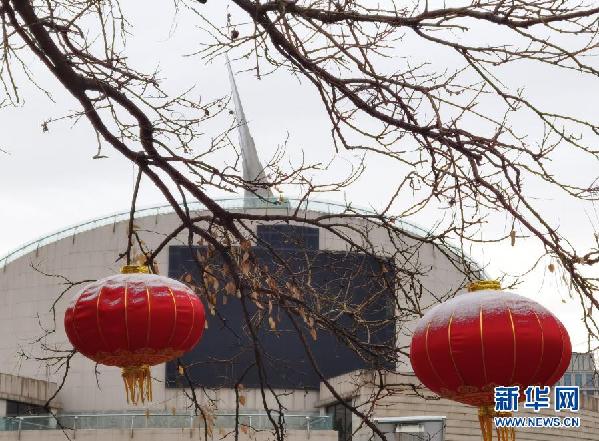 3月1日,在北京中華世紀(jì)壇附近,兩只紅燈籠頂部被積雪覆蓋。