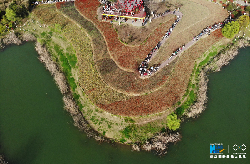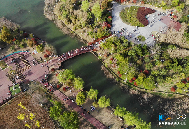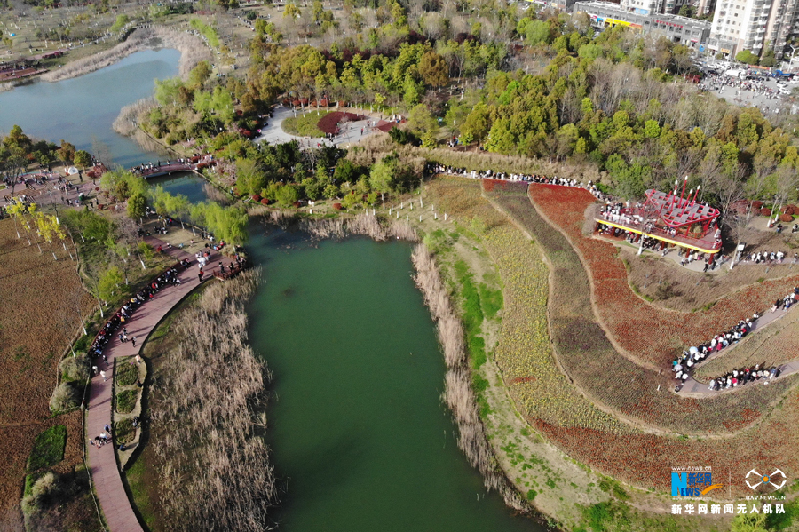 3月28日,游客在安徽省合肥市蜀山區(qū)四季花海公園踏春(無人機照片)。新華網(wǎng)發(fā)(葛宜年 攝)
