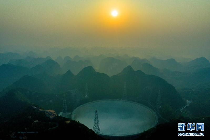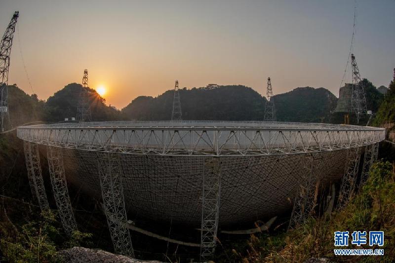 3月29日拍攝的晚霞中的“中國天眼”(維護(hù)保養(yǎng)期間拍攝)。