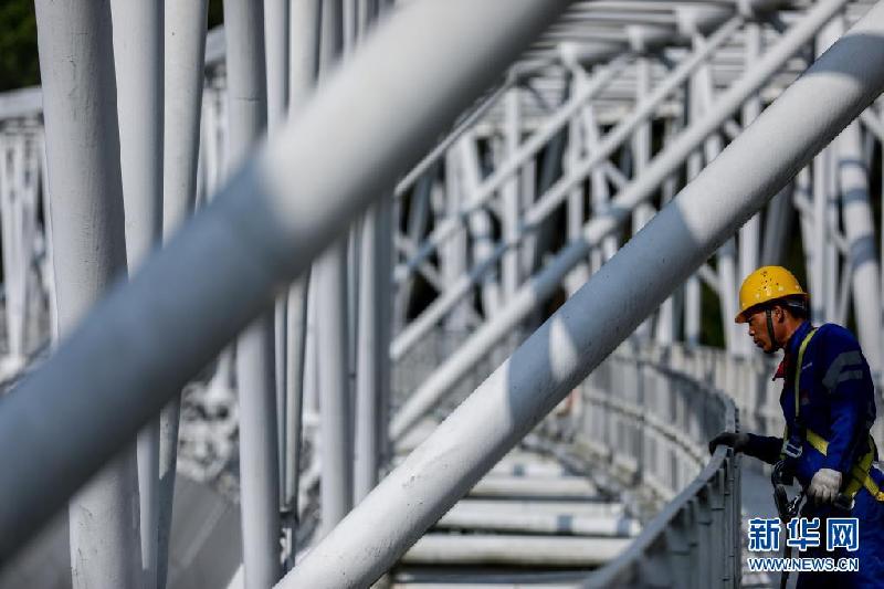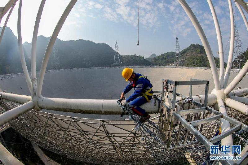 3月29日,工作人員對“中國天眼”圈梁進(jìn)行維護(hù)(維護(hù)保養(yǎng)期間拍攝)。