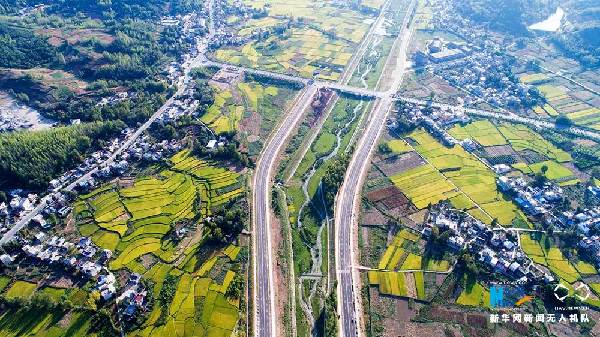 圖為從空中俯瞰,十房高速穿過村莊田野,油菜花海,像一幅美麗的畫卷。新華網(wǎng)發(fā)