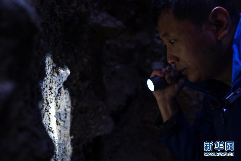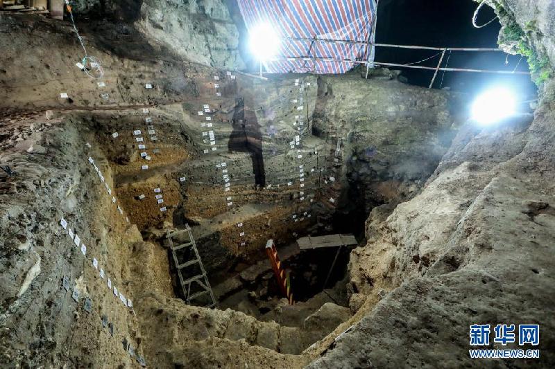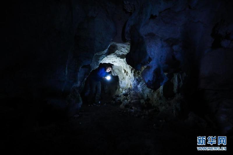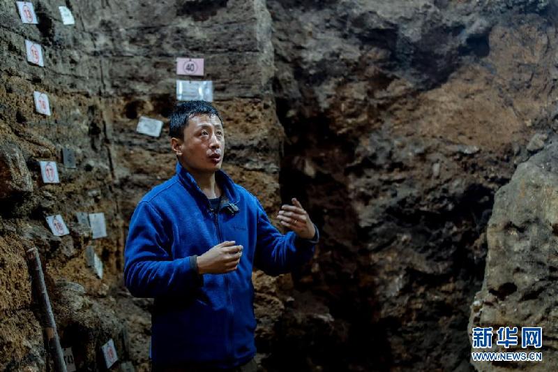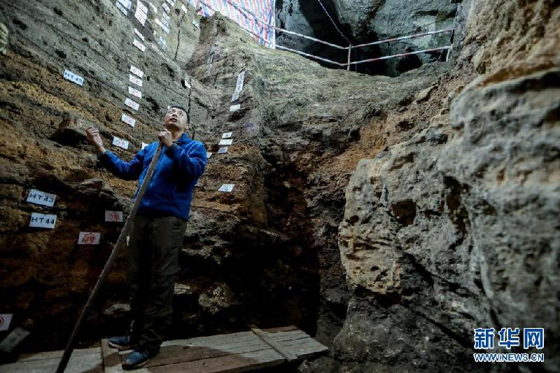 4月16日,工作人員在貴州貴安新區(qū)招果洞遺址內(nèi)考察。