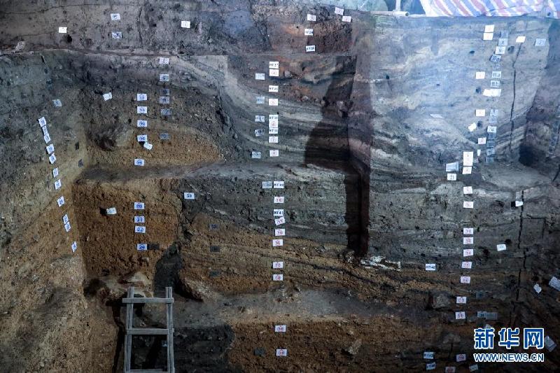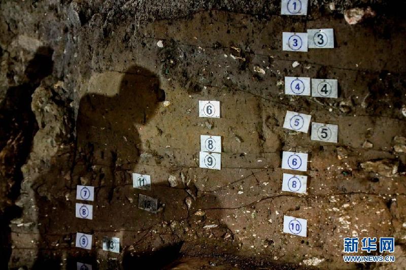 4月16日,工作人員的身影投射到貴州貴安新區(qū)招果洞遺址內(nèi)的地層堆積序號牌上。