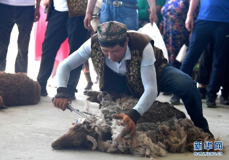 6月3日,在新疆阿勒泰地區(qū)福海縣沙爾布拉克轉(zhuǎn)場文化旅游小鎮(zhèn),牧民參加剪羊毛比賽。