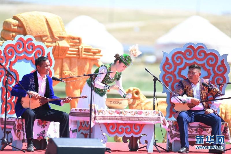 6月3日,在新疆阿勒泰地區(qū)福??h沙爾布拉克轉(zhuǎn)場文化旅游小鎮(zhèn),人們參加阿肯阿依特斯表演。