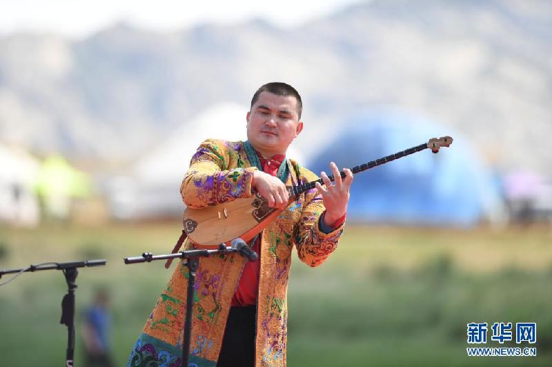 6月3日,新疆阿勒泰地區(qū)福??h沙爾布拉克轉(zhuǎn)場文化旅游小鎮(zhèn),演員在彈奏冬不拉。