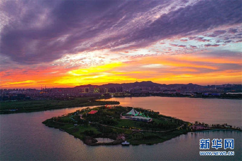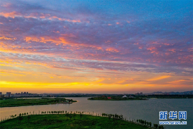 安徽省淮北市中湖航拍的“火燒云”景觀。