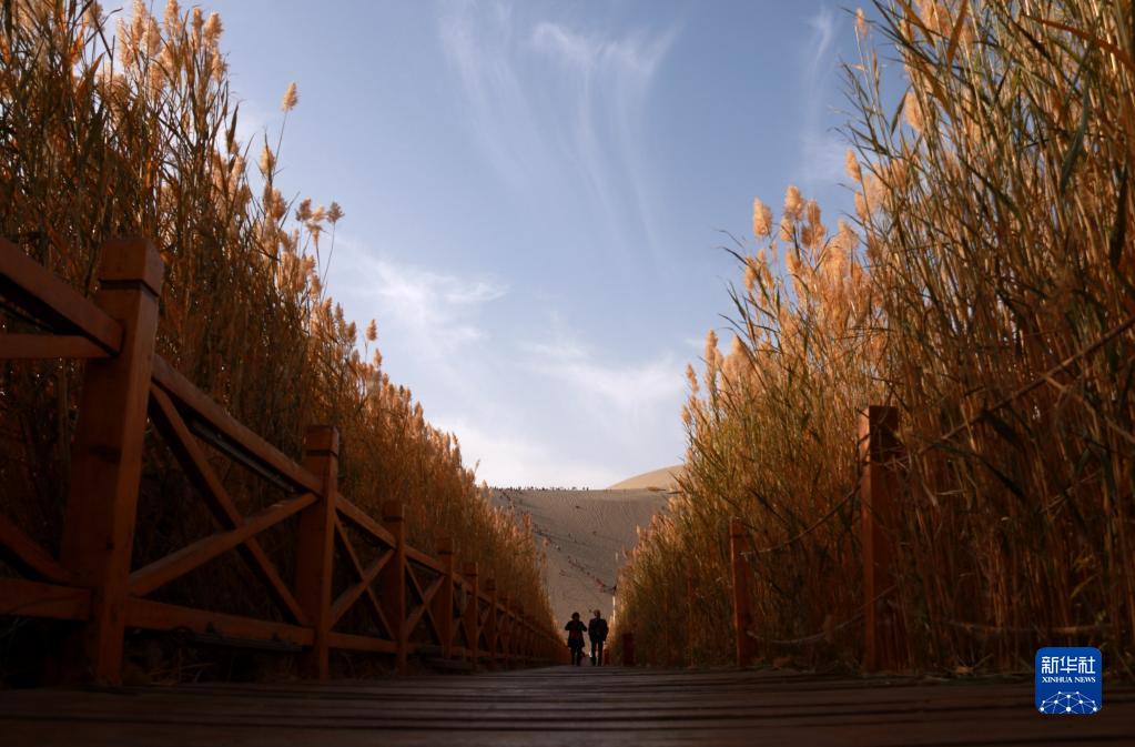 金秋時(shí)節(jié),在甘肅省敦煌市鳴沙山月牙泉景區(qū),大漠、駝隊(duì)、藍(lán)天、泉水、蘆葦......構(gòu)成一幅美麗迷人的畫卷,吸引眾多游客。新華社發(fā)(張曉亮攝)