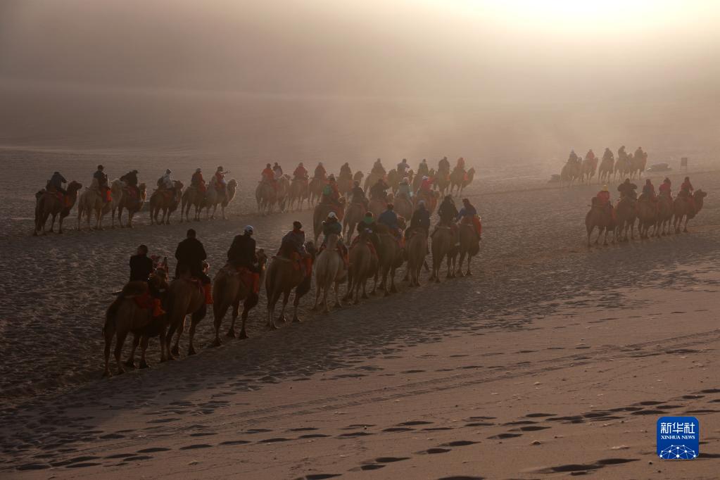 10月17日,游客在甘肅省敦煌市鳴沙山月牙泉景區(qū)騎駱駝?dòng)斡[。
