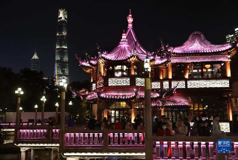 11月3日拍攝的上海豫園九曲橋的夜景。