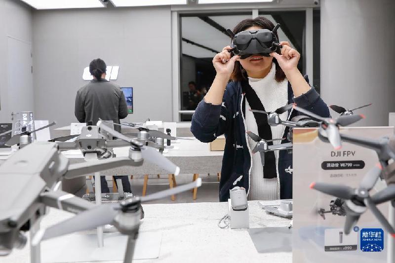 11月3日,顧客在上?!癉JI|哈蘇融合店”內(nèi)體驗(yàn)飛行眼鏡。