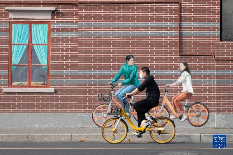 11月3日,在上海市靜安區(qū)平德里,行人從墻繪作品前騎車經(jīng)過。